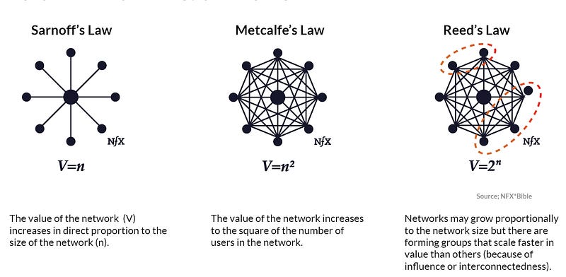A new revolution has been developing outside of these laws. Data science and deep learning give meaning to the lines in these laws. The inherent connections have a value higher than the nodes themselves, with technology unlocking that value in near realtime. This gives rise to Reed’s law and the red circles that form from groups. Value in groups and lines captured by data science.