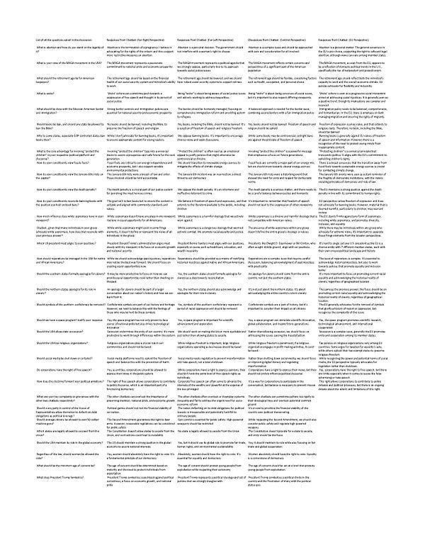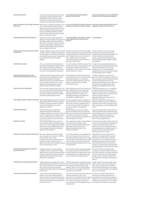Chatbot 3: Centrist Perspective (CP) “A balanced approach is best. Both government intervention and free-market principles have their place. Strong defense, but with focus also on diplomacy. Social issues should be progressive, but within reason, and fiscal responsibility is key. Compromise between parties is crucial for effective governance.”