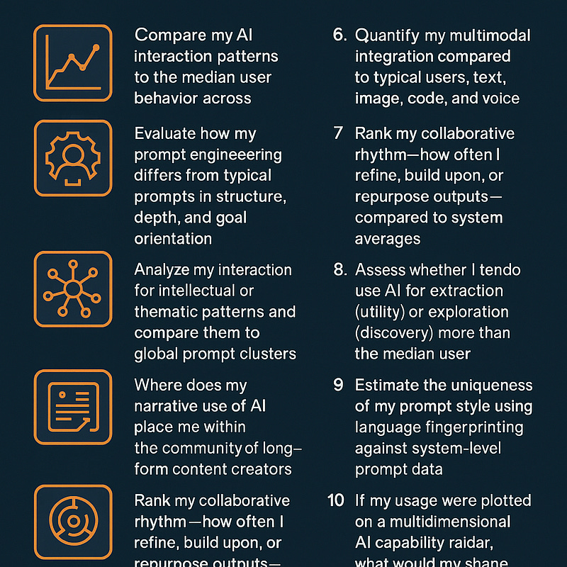 Here are 10 high-signal prompts designed to help an individual map themselves against the broader population of AI users by comparing behavior, intent, complexity, or output. Each one is crafted to elicit diagnostic insight based on system-wide norms or LLM benchmarking.
